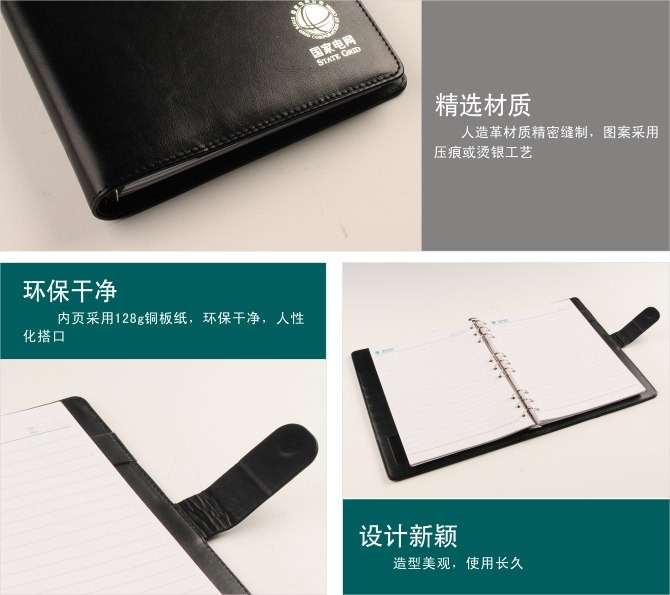 特點:封面采用高檔仿皮,內頁采用銅版紙,紙張表面光滑,白度較高,紙質纖維分布均勻,厚薄一致,伸縮性小,有較好的彈性和較強的抗水性能和抗張性能,對油墨的吸收性與接收狀態十分良好。