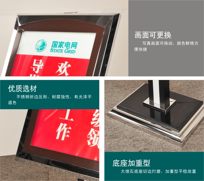 產品外觀啞光不銹鋼清純高雅;具有牢固扎實,耐腐蝕,不變形,不褪色,容易保養,容易回復光澤,而且使用時間越長色澤更好;加重底座便于安放平穩,后面可活動便于更換內容。