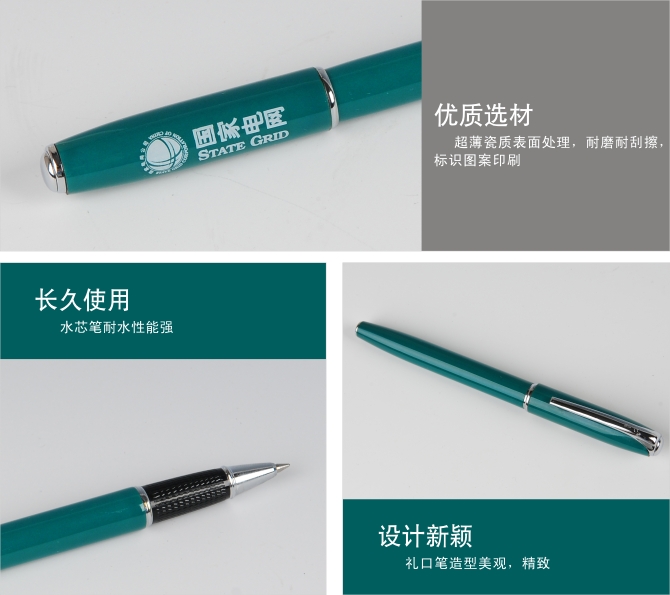 禮品筆:超薄的資質(zhì)表面處理,使該筆耐磨耐腐、耐刮花,產(chǎn)品馬面歷久彌新,凝脂如玉,永不磨損,極富質(zhì)感。訂質(zhì)產(chǎn)品加上國家電網(wǎng)LOGO,用琺瑯彩瓷術(shù),經(jīng)高溫?zé)贫妫琇OGO和國網(wǎng)綠色彩不易脫落,筆身流線型設(shè)計(jì),手感舒適
