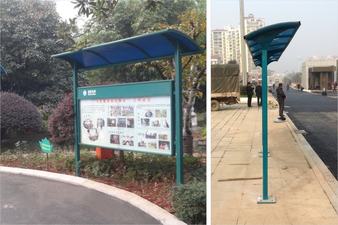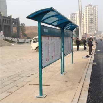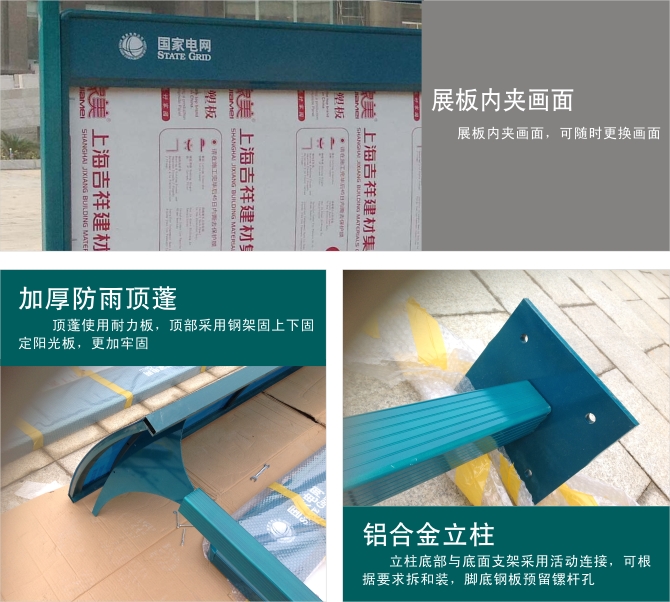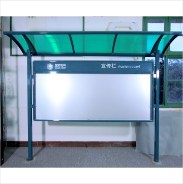 1、宣傳欄頂部采用鋼架固定綠色陽光板,這樣固定起到牢固作用。
