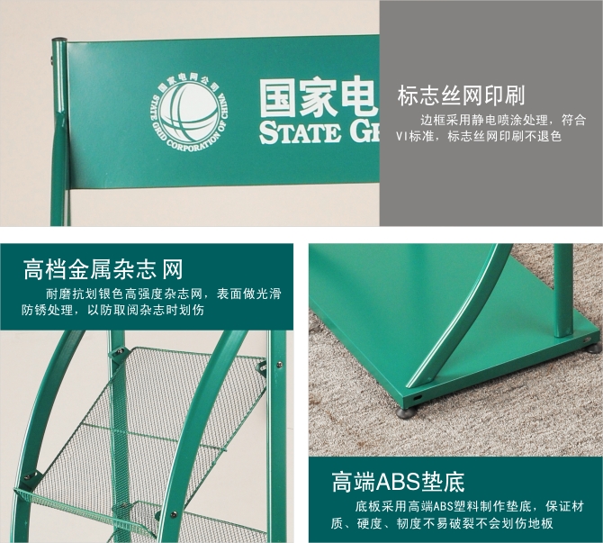 2、配有雜志網,架子表面做光滑防銹處理,以防取閱雜志時劃傷