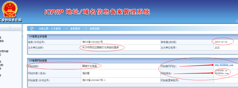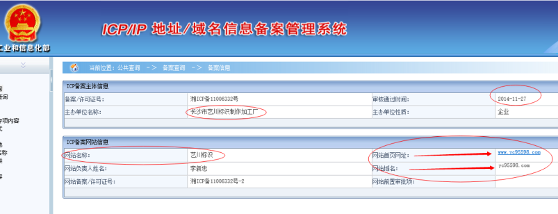 藝川標識官網域名yc95598.com的工信部備案信息截圖