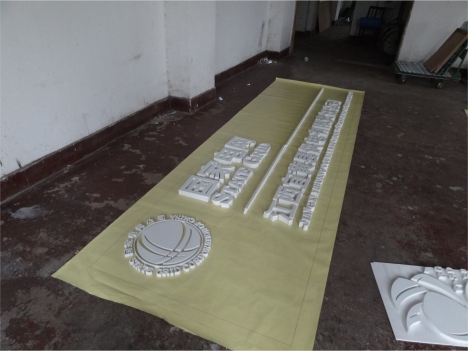 會議室背景墻案例圖:中間內圓與圈外中英文分開,標志為平面和周邊小字、大字和英文字都用PVC結皮板雕刻再噴漆底板采用鋁塑板。