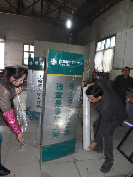 國家電網標語牌為鋁形材表面打磨處理后噴底漆和面漆,絲印內容后再在表面上再噴一層透明清漆,作工精細能夠保護絲印的內容不受磨損,又分平面和弧面。