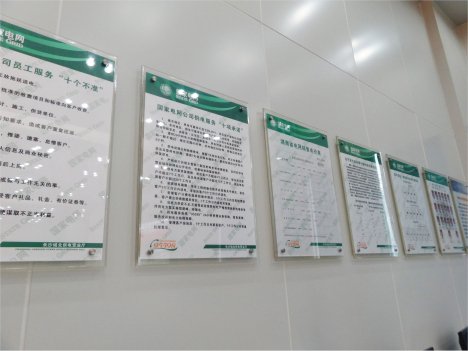 上墻制度牌安裝效果:堅韌、透明、不易碎、不變色;產品具有極佳的耐候性和表面光澤,以及較好的高溫性能,能根據客戶要裝燈。