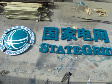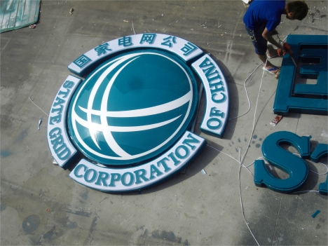 樓頂發光標志安裝案例:按國家電網VI標準將標志做成圓形平面分塊模具;分塊且統一,立體感強,透光效果好等特點;用亞克力固定模具加熱成型,將成型的個體切邊切角粘接熱熔成標志形狀中獨立的個體;標志獨立的分塊個體內裝燈與周邊小字一起粘貼在鏤空好的鋁塑板上;將粘好的標志用鋁合金邊框圍邊,做成箱體,用鋁塑板或PVC板做成底板并裝上燈具與標志箱體固定好后成發光標志;尺寸可根據客戶要求定做